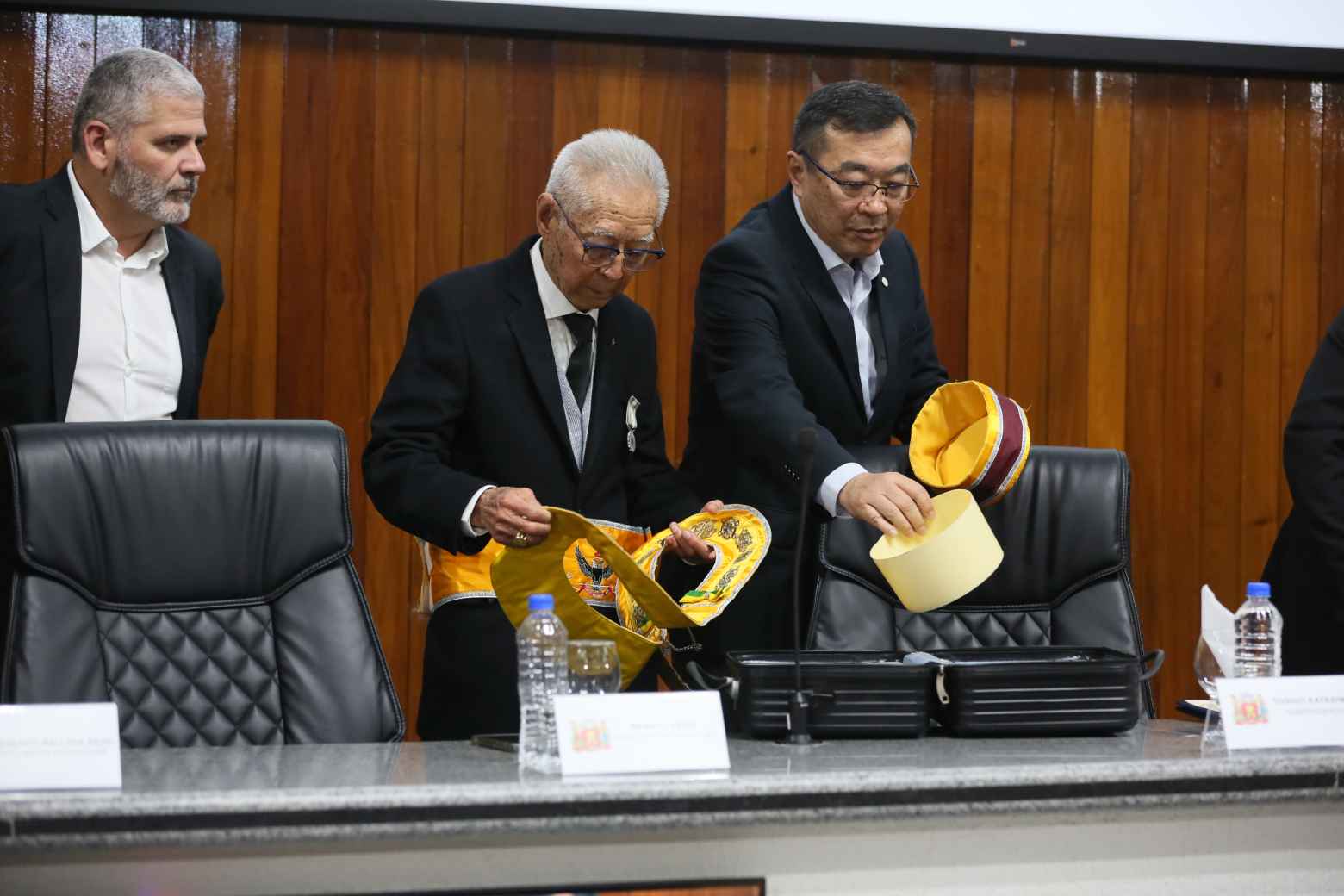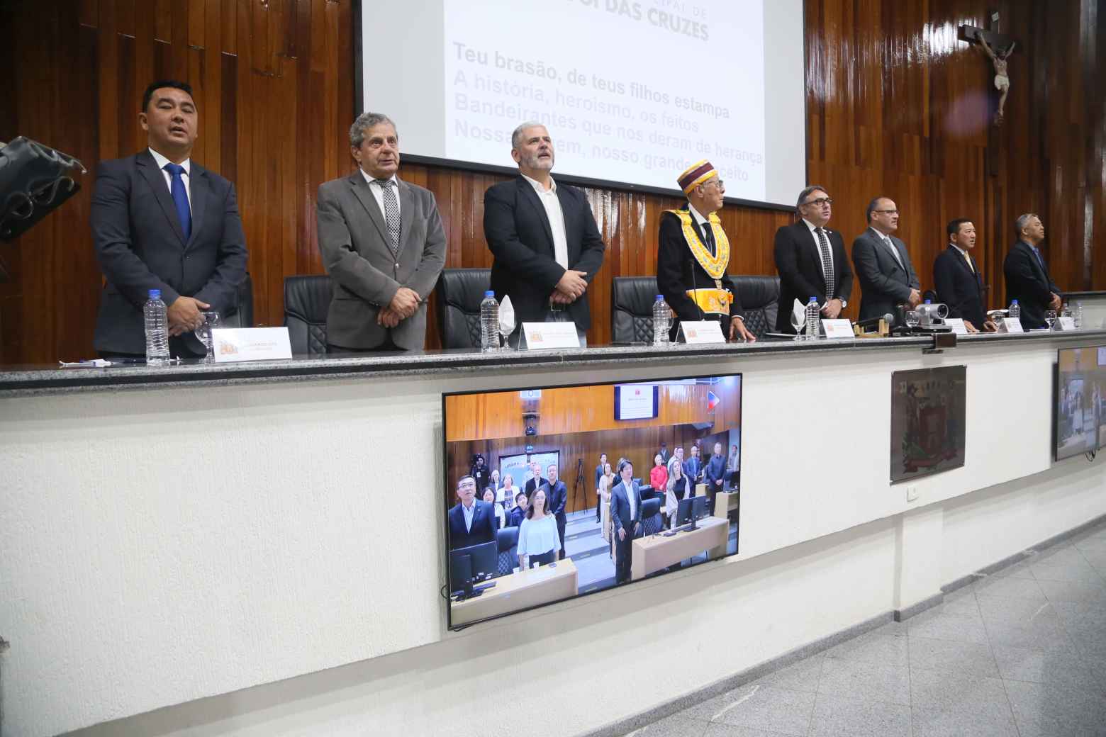 Farofa presidiu os trabalhos legislativos da noite de condecoração, com o vereador Maurinho do Despachante (PRD) ocupando a primeira secretaria. Além deles, compuseram a mesa diretiva o vereador Edu Ota, coautor da homenagem, o ex-prefeito e ex-deputado Junji Abe, Renato Abdo, secretário Municipal de Agricultura e Segurança Alimentar — representando a prefeita de Mogi, Mara Bertaiolli (PL), Benedito Balouk Filho, grão-mestre ad vitam do GOSP (Grande Oriente de São Paulo), Frank Tuda, presidente do Bunkyo Mogi das Cruzes, e o homenageado.