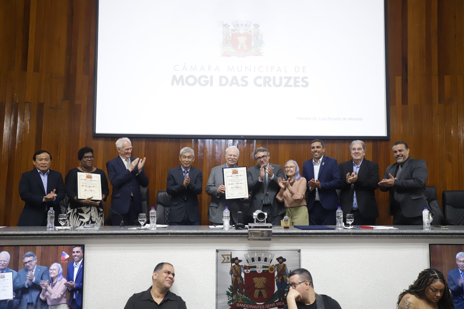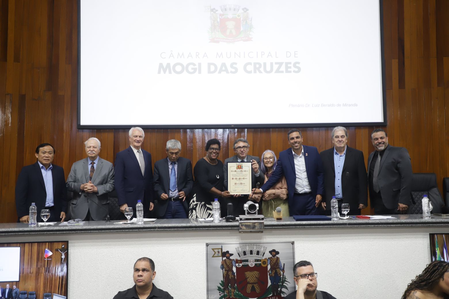 A Câmara Municipal de Mogi das Cruzes realizou, na noite desta terça-feira (16), sessão solene para a entrega do Título de Honra ao Mérito ao Sesc – Serviço Social do Comércio, Unidade Mogi das Cruzes. A homenagem reconhece os relevantes e notáveis serviços prestados pela instituição ao município, com forte atuação nas áreas social, cultural, educacional, esportiva e de lazer, impactando diretamente a qualidade de vida da população mogiana. Na mesma sessão, também foram homenageados o presidente em exercício da Fecomércio, Ivo Dall’Acqua Junior, e o diretor do Sesc São Paulo, Luiz Galina, ambos agraciados com o Título de Cidadão Mogiano.