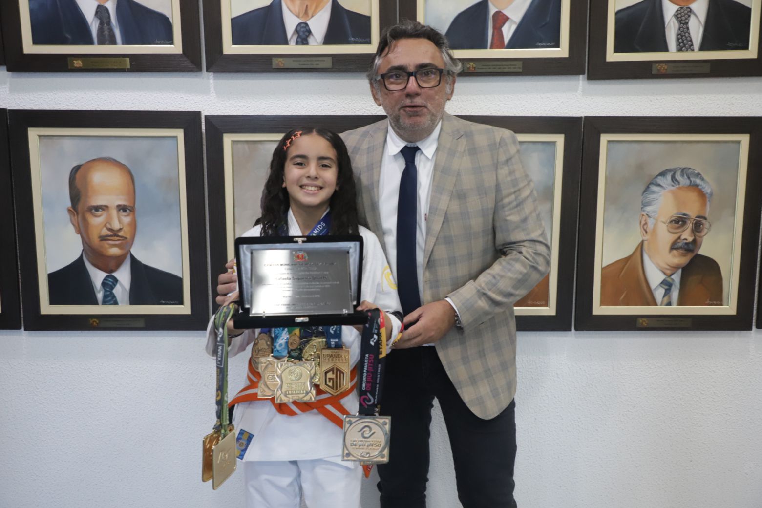 O documento destaca que Rafinha, com apenas 10 anos, já acumula 36 medalhas, sendo 22 de ouro, 7 de prata e 7 de bronze. Entre suas conquistas em 2025, destacam-se o título de Campeã Brasileira Kids – CBJJ, Campeã Floripa Winter Internacional Open Kids – CBJJ e Campeã II Etapa Copa Grandes Mestres – FPJJ.