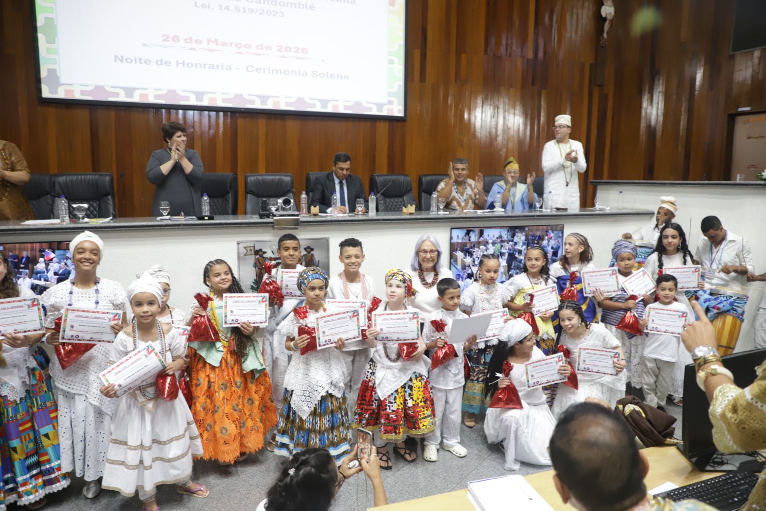 A solenidade reservou também um espaço especial dedicado às Crianças do Axé, celebrando a continuidade, a memória viva e o futuro das tradições. O momento reforçou a importância de proteger e guiar as novas gerações, garantindo que o legado ancestral permaneça pulsando com orgulho e identidade. Foram homenageadas as crianças Rayssa de Oyá, Isabel de Iemanjá, Rayane de Yewa, Agatha de Oxum, Kayke de Ayra, Yago de Oxóssi, Nayra Freitas, Lorena Arias, Pietra Eleonora, Maria Eduarda, Egbón Bruna de Nanã, Egbon Beatriz de Oxum, Rebeca de Oxum, Lara de Obá, Cristhian de Oxoguian, Bernardo Andrade Ramos e Elis Martins Traforti Miranda.