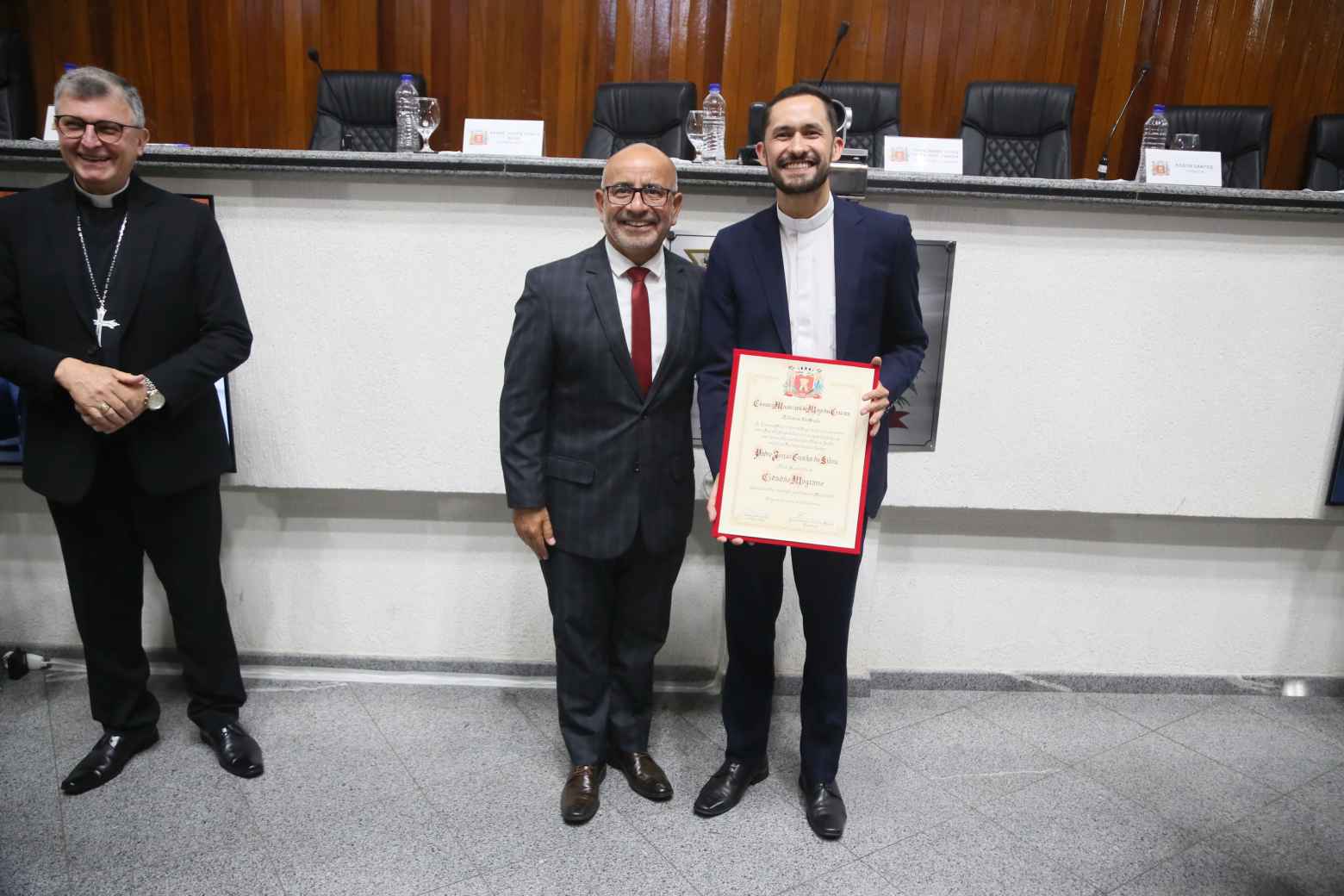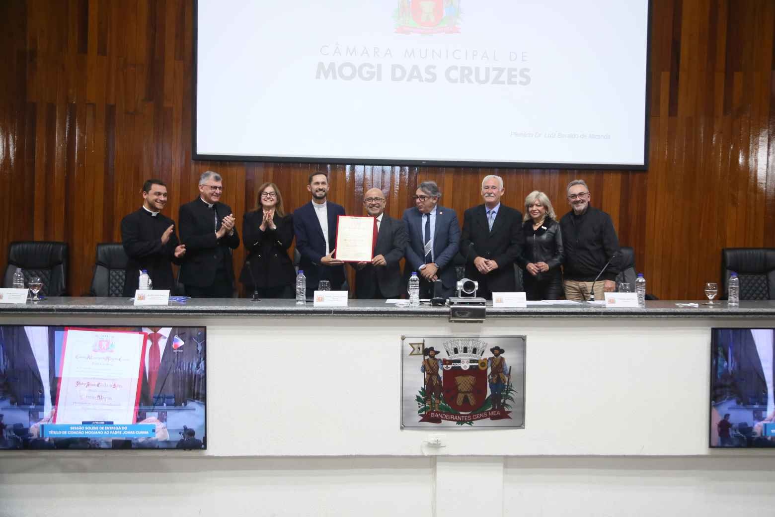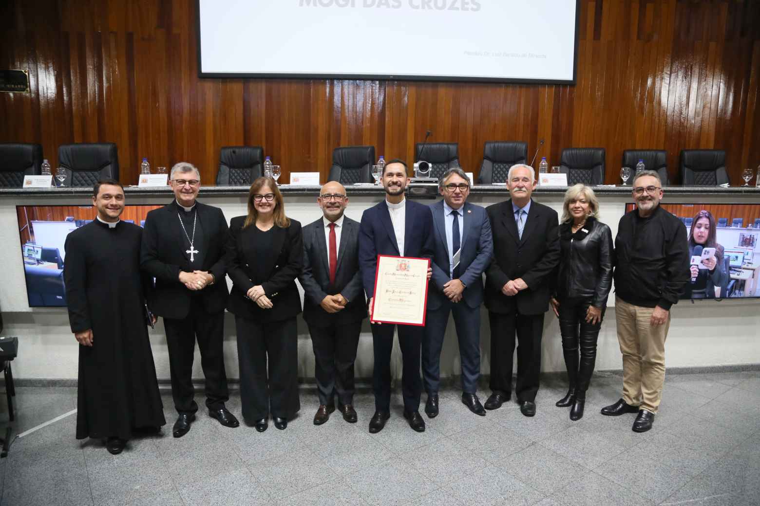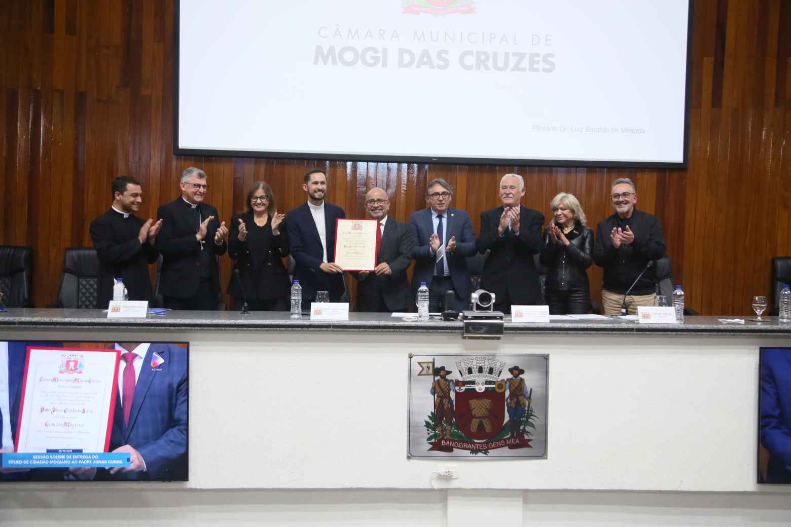 A Câmara Municipal de Mogi das Cruzes realizou, na noite desta terça-feira (21), sessão solene para entrega do título de Cidadão Mogiano ao padre Jonas Cunha da Silva. De autoria do vereador Edson Santos (PSD), a homenagem tem como objetivo reconhecer a atuação do sacerdote na cidade e os relevantes serviços prestados pelo pároco.
