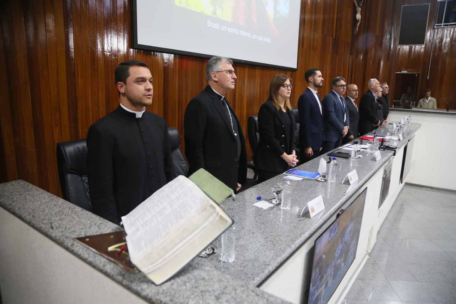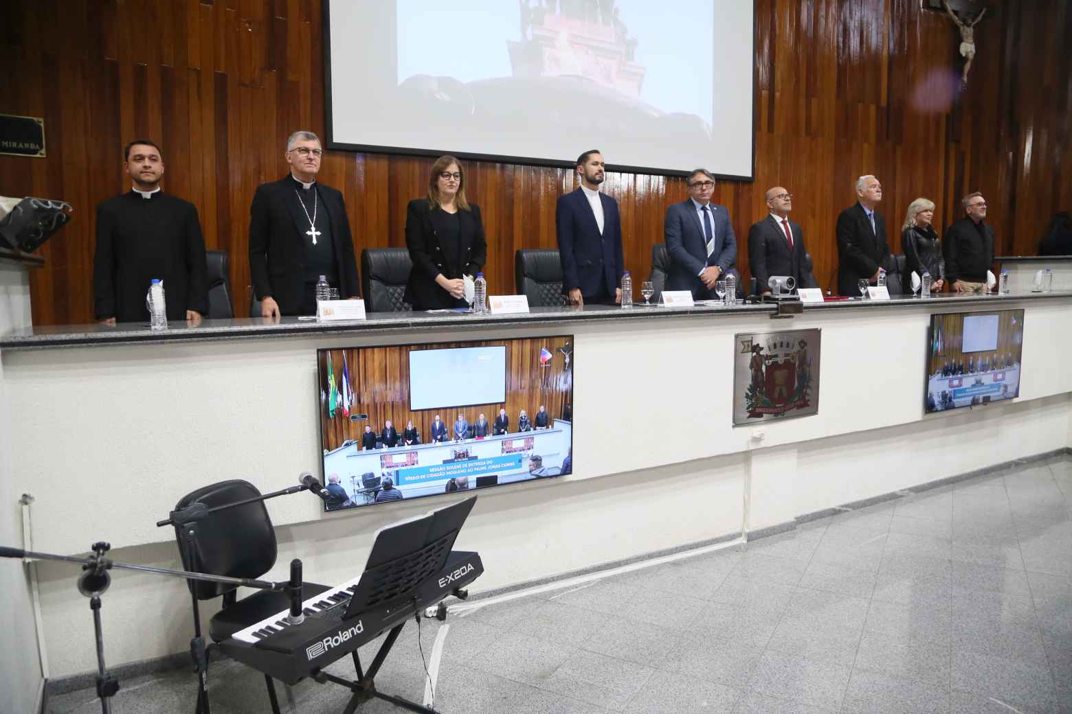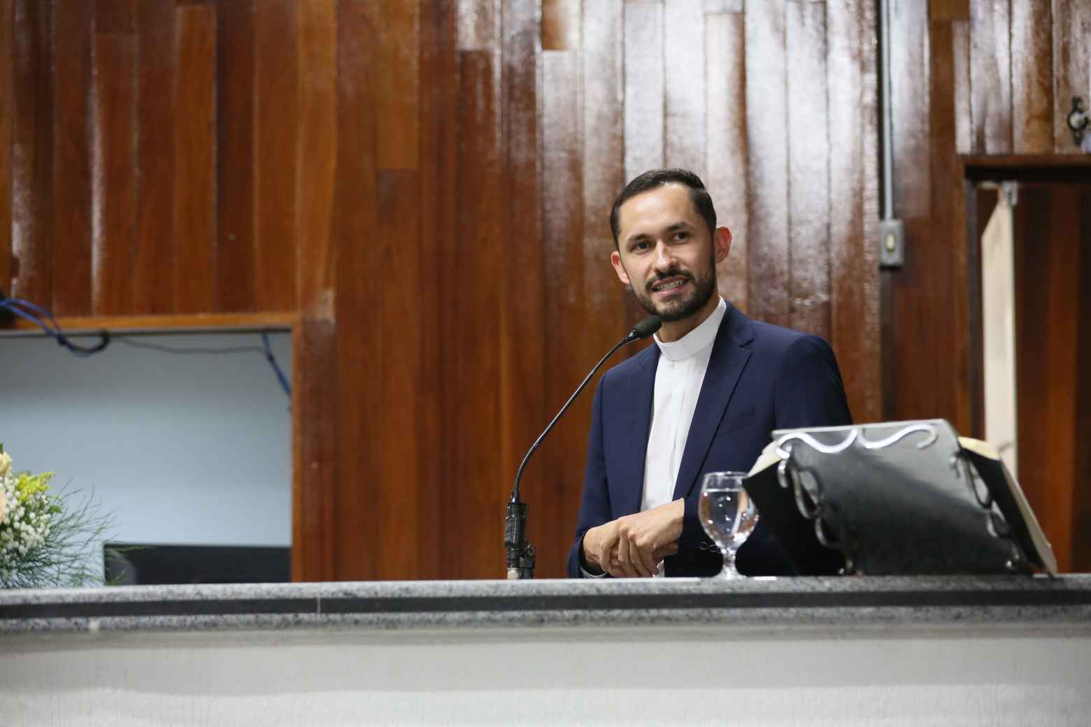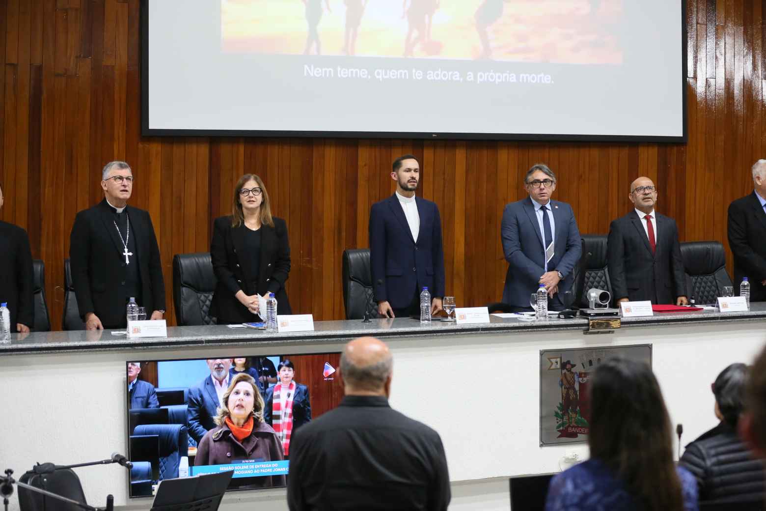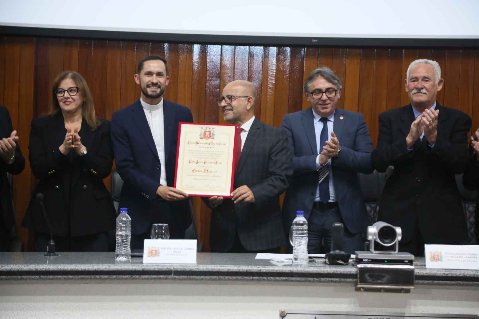 A Câmara Municipal de Mogi das Cruzes realizou, na noite desta terça-feira (21), sessão solene para entrega do título de Cidadão Mogiano ao padre Jonas Cunha da Silva. De autoria do vereador Edson Santos (PSD), a homenagem tem como objetivo reconhecer a atuação do sacerdote na cidade e os relevantes serviços prestados pelo pároco.