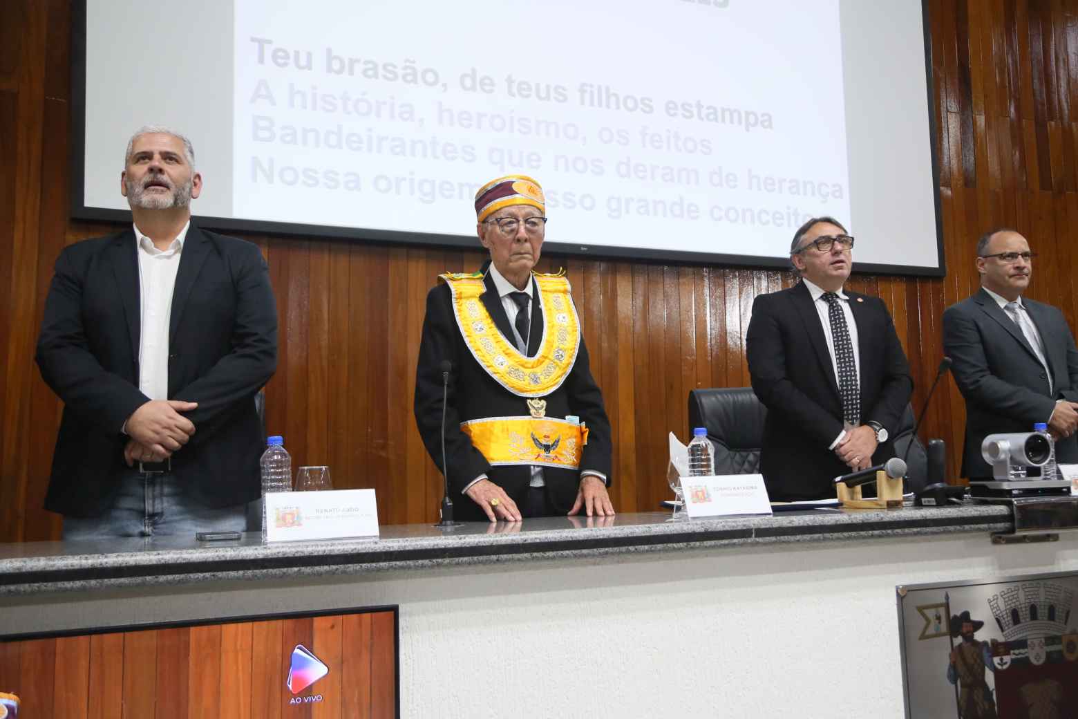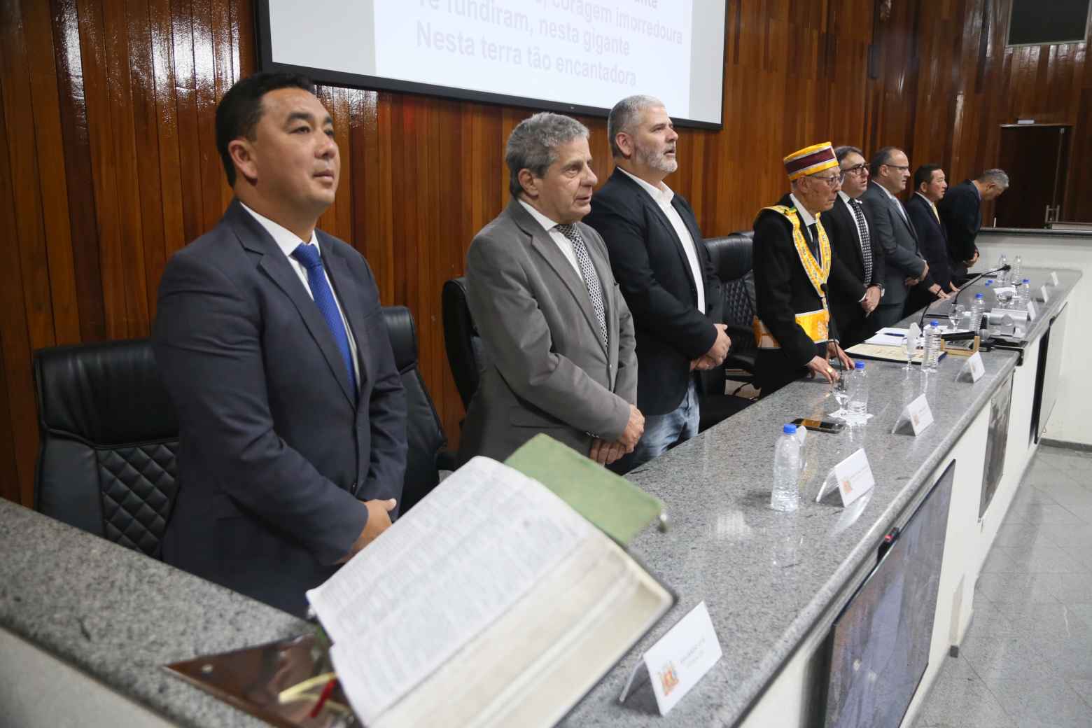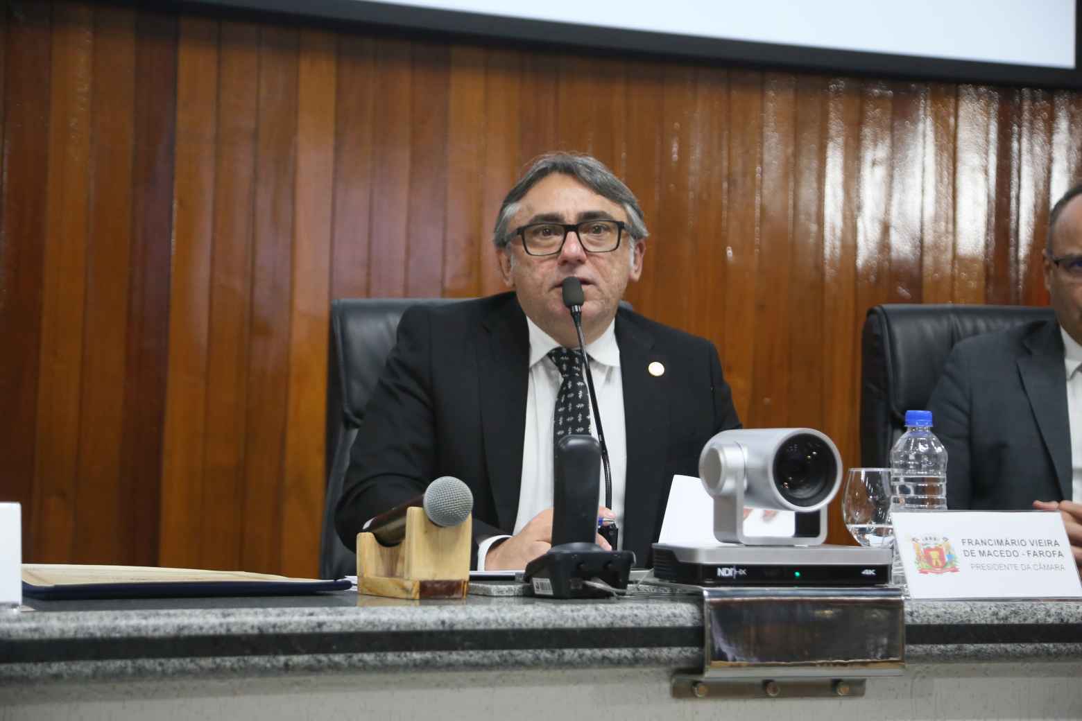 Farofa presidiu os trabalhos legislativos da noite de condecoração, com o vereador Maurinho do Despachante (PRD) ocupando a primeira secretaria. Além deles, compuseram a mesa diretiva o vereador Edu Ota, coautor da homenagem, o ex-prefeito e ex-deputado Junji Abe, Renato Abdo, secretário Municipal de Agricultura e Segurança Alimentar — representando a prefeita de Mogi, Mara Bertaiolli (PL), Benedito Balouk Filho, grão-mestre ad vitam do GOSP (Grande Oriente de São Paulo), Frank Tuda, presidente do Bunkyo Mogi das Cruzes, e o homenageado.
